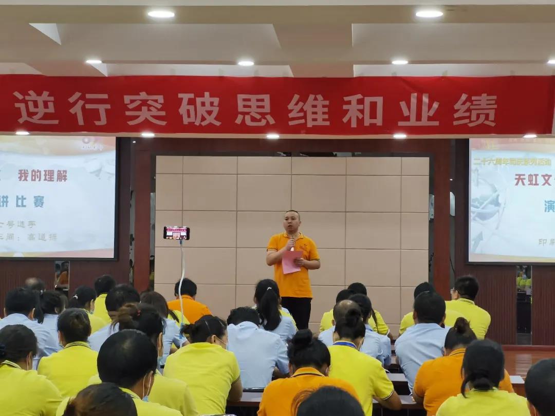 為了進一步弘揚和傳承公司“三個三”文化精神,讓“三個三”文化生根在員工心中,落地在公司的發(fā)展中,踐行在每名員工的行動中,同時也為員工搭建展示才華的舞臺,不斷充分挖掘員工的潛質,培養(yǎng)有激情、有活力的天虹人。8月3日,在公司26周年司慶來臨之際,開展“天虹文化,我的理解”演講比賽。