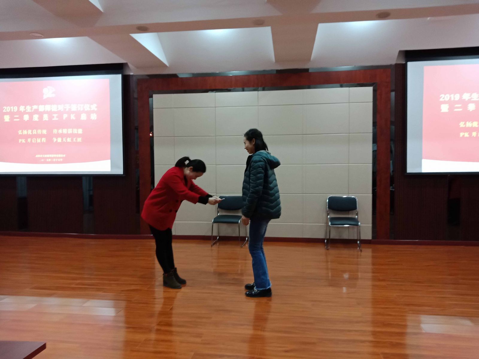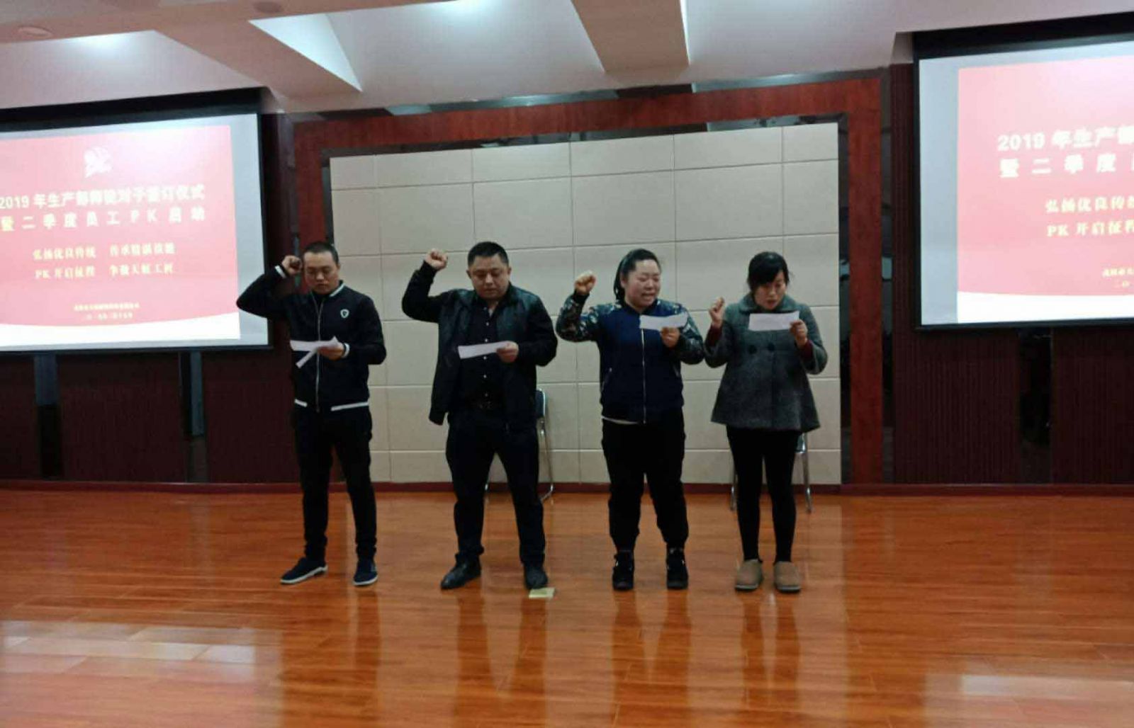 拜師的香茶仍溫,莊嚴(yán)的承諾余音繞梁,主持人緊接著又宣布2018年第四季度員工PK兌現(xiàn)和2019年第二季度員工PK啟動(dòng)。員工PK是自2018年第四季度開始舉辦,旨在將產(chǎn)品品質(zhì)、產(chǎn)出率、節(jié)能降耗等生產(chǎn)目標(biāo)通過員工間、班組間進(jìn)行PK的形式進(jìn)行提升和達(dá)成。