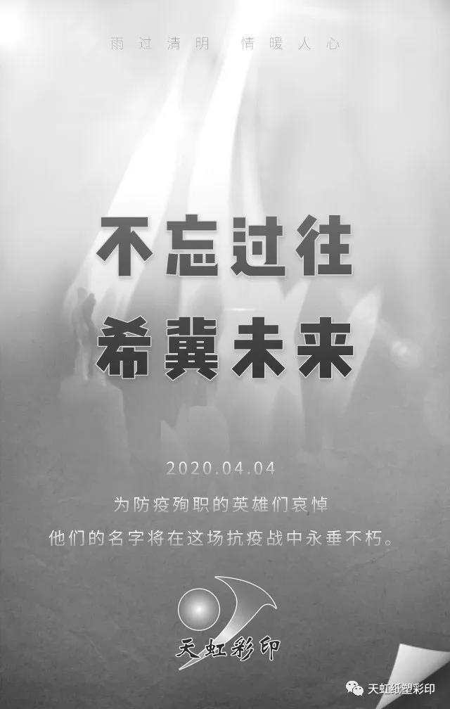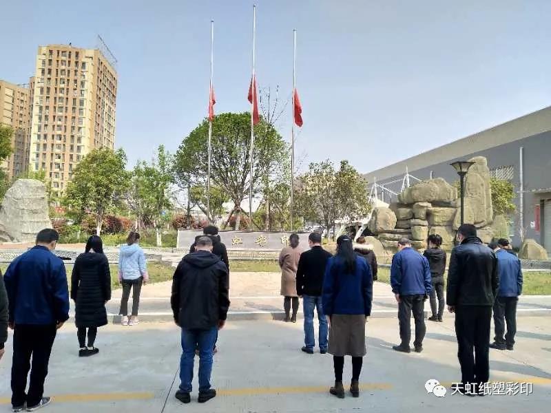 為表達(dá)在抗擊新冠肺炎疫情戰(zhàn)斗中犧牲的烈士和逝世同胞的深切哀悼,4月4日上午10時(shí)整,武漢市天虹紙塑彩印有限公司降半旗致哀,公司董事長(zhǎng)陳志浩帶領(lǐng)行政管理人員集體默哀3分鐘,向英雄致敬,為逝者祈福!